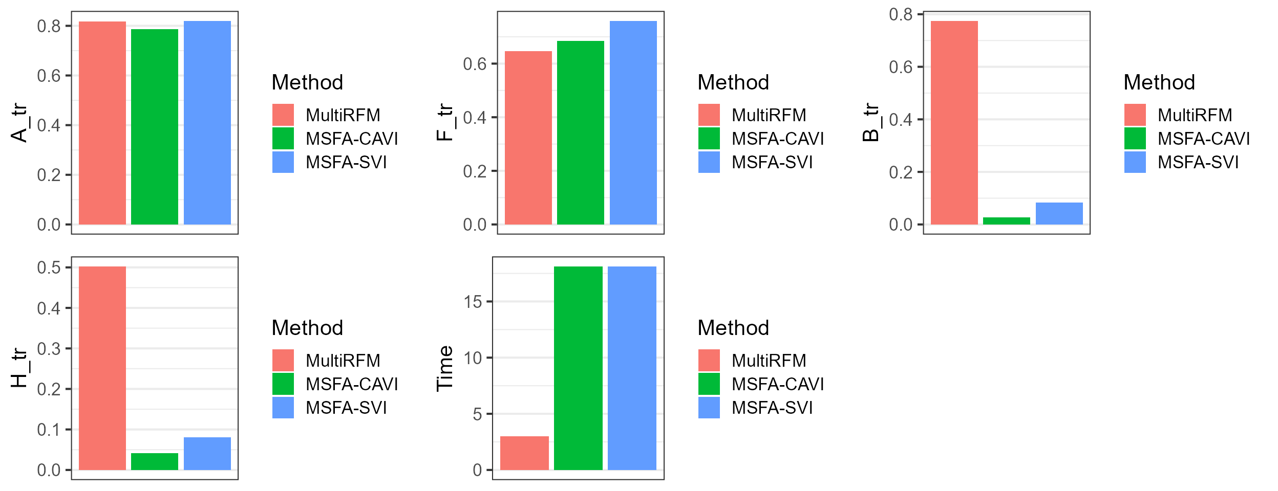 metricMat["MultiRFM",'H_tr'] <- trace_list_fun(res$H, datList$Hlist)We compare MultiRFM with two prominent methods: MSFA-CAVI and MSFA-SVI
